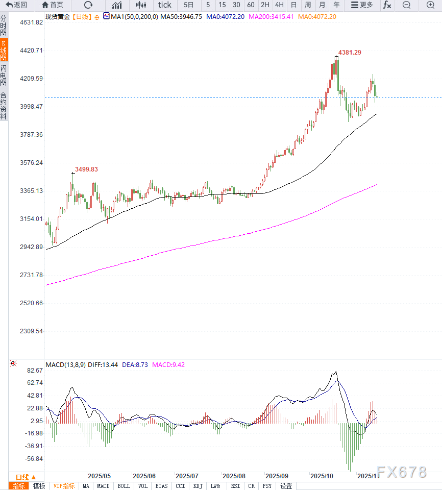若突破该位置,则可能进一步尝试挑战4200美元的重要关口。反之,若跌破 4050美元(4小时200周期均线),可能触发新一轮下跌,下方支撑4030美元(周五低点)关键心理位:4000美元,一旦被击穿,空头或将重新取得主导。
