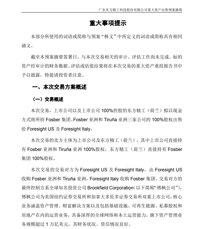 11月28日,东方精工(002611)(002611.SZ)公告称,公司以及公司100%控股的东方精工(荷兰)拟以现金方式将所持Fosber集团、Fosber亚洲和Tiru a亚洲三家公司的100%股权出售给Foresight US及Foresight Italy。本次交易预计构成重大资产重组,交易价格由双方协商确定,基础价格合计为7.74亿欧元。交易尚需履行内部审批程序及外部审批程序,包括但不限于意大利和西班牙的外商直接投资审查、美国等多国的反垄断审查等。